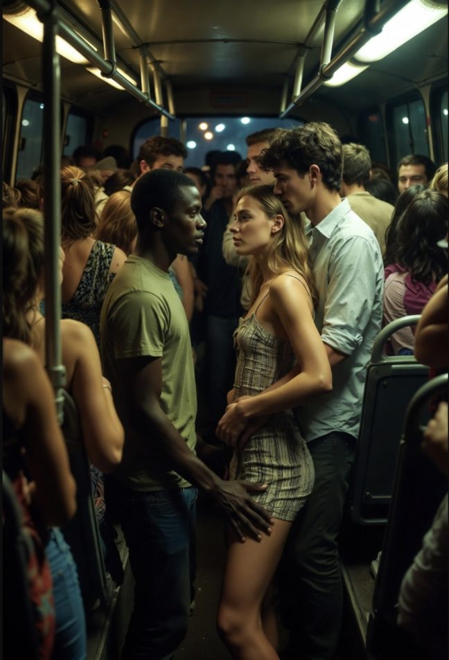 Then a tall black guy squeezed in next to us. He stood right behind Lexi almost pressing against her. The bus swayed, and his hand, as if by accident, landed on her thigh. I saw Lexi tense up, but she didn’t move away. She simply turned her head toward me and whispered: «It’s a bit crowded in here, huh?» I nodded, though something inside me was burning. His hand remained on her thigh. Then his fingers slowly slid down her leg, under the hem of her dress.